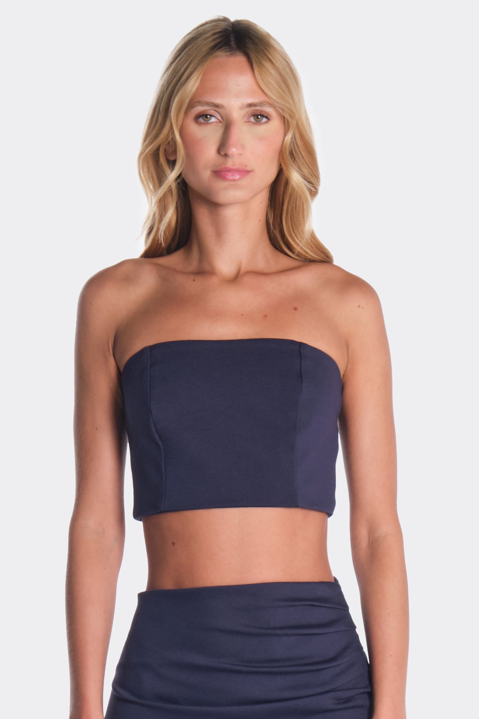 Nahil Top, es una pieza estructurada de líneas limpias y minimalistas. Su diseño strapless realza el torso con elegancia y precisión, creando una silueta firme pero femenina. Pensado para acompañar la falda o para usarse de forma independiente, es un top versátil que transmite fuerza, equilibrio y sofisticación.